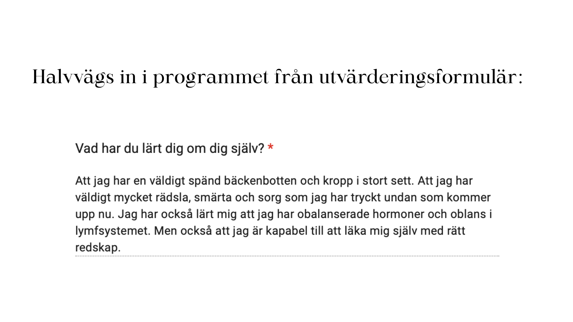 "Helhetssyn i denna kurs har öppnat många kanaler för mig, som får mig att känna att det är inte omöjligt att även ha en frisk och fungerande kropp vid 52 års ålder, och att man definitivt förtjänar den också.