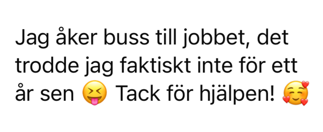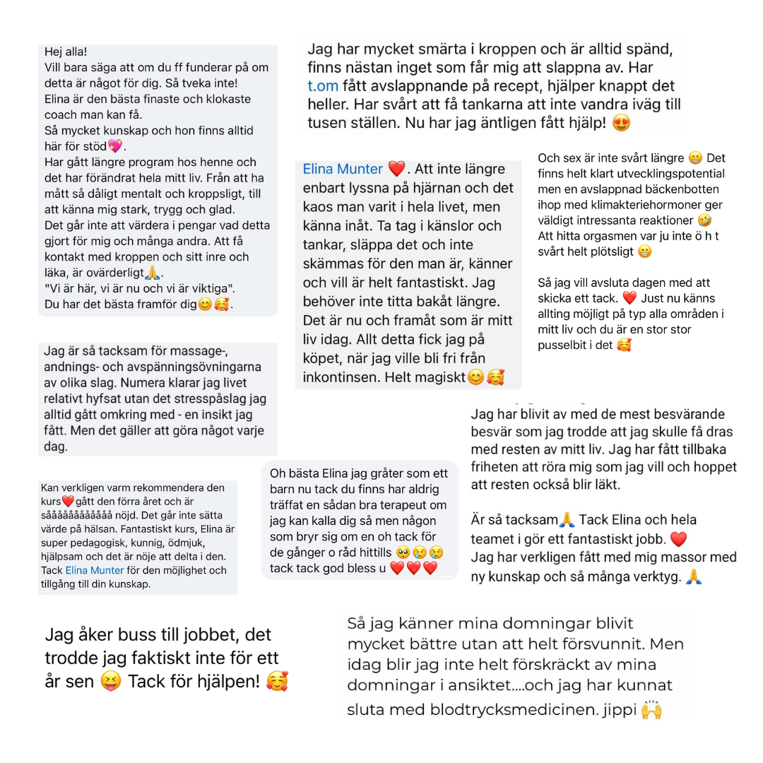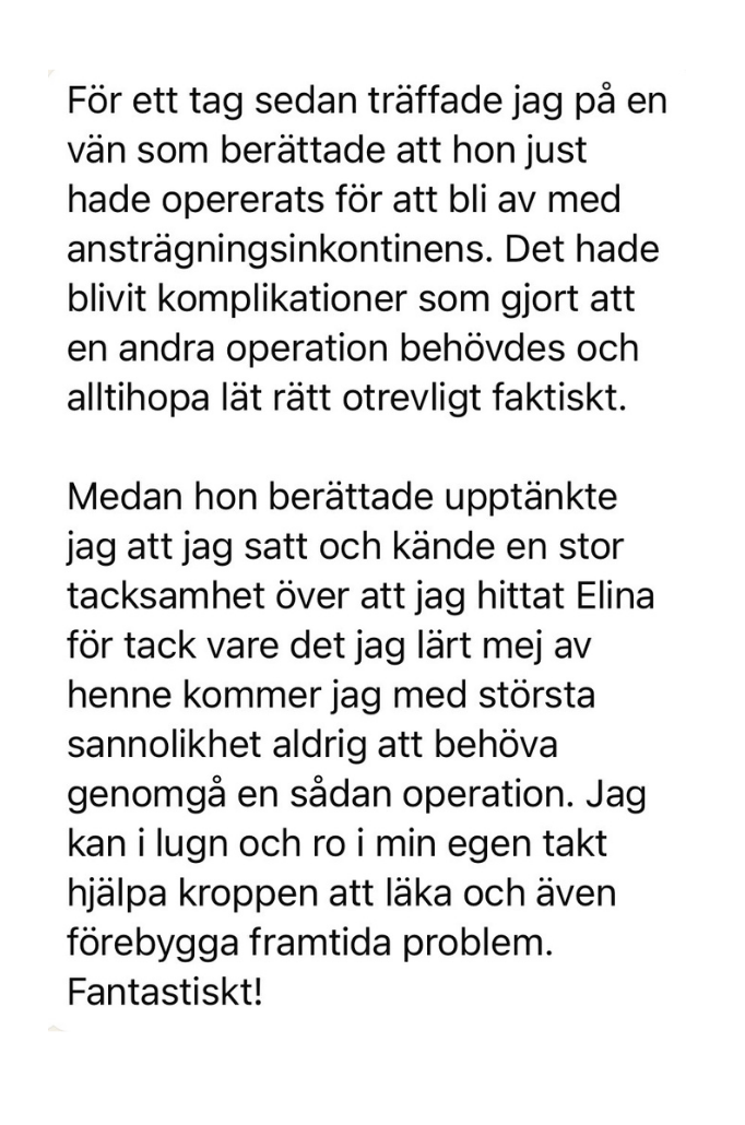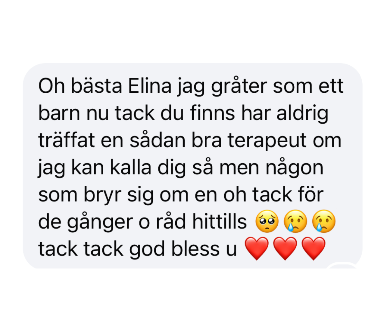 Jag är också otroligt tacksam för den hjälp jag fått och att du öppnade upp för mig att läka från mitt tidigare trauma. Jag trodde aldrig att det skulle kunna gå att stänga igen helt och kunde själv inte se sambandet mellan kroppen och det...så från mitt innersta: TACK!"