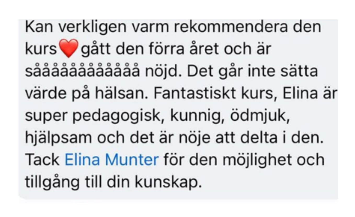 "Elina är extremt påläst och hennes kurs är givande på så många plan. För bra för att låta bli helt enkelt.